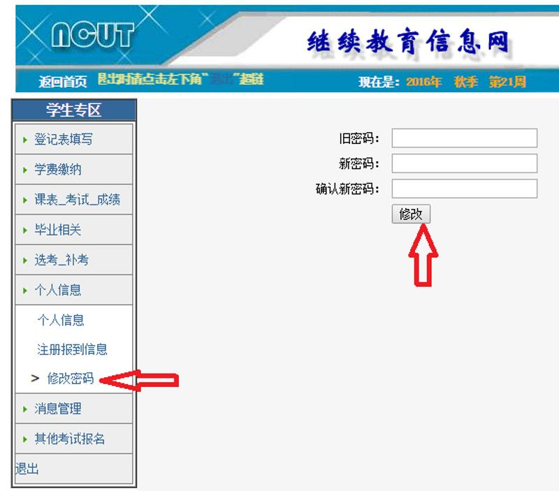 一、特别提示:继续教育信息网(http://jjxx.ncut.edu.cn/)是今年会教学综合服务平台,登陆个人账号,可查询在校期间教学通知、学期课表、考试安排、课程成绩、注册缴费、学籍变动、学业审核等各种信息。请大家登陆后首先修改密码,并妥善保管!