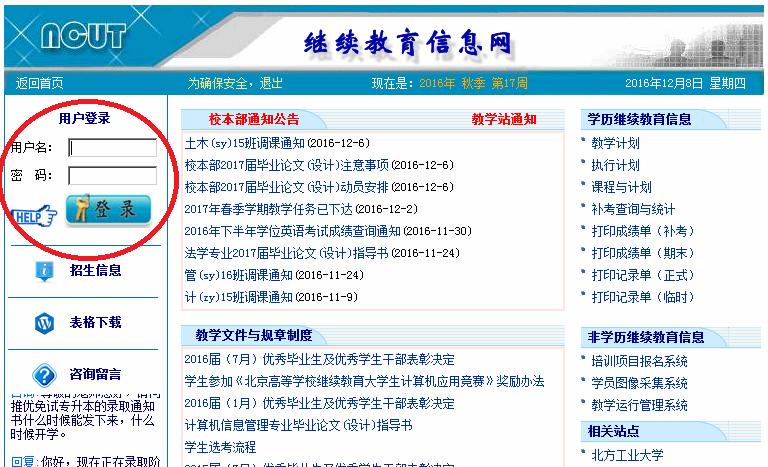 一、特别提示:继续教育信息网(http://jjxx.ncut.edu.cn/)是今年会教学综合服务平台,登陆个人账号,可查询在校期间教学通知、学期课表、考试安排、课程成绩、注册缴费、学籍变动、学业审核等各种信息。请大家登陆后首先修改密码,并妥善保管!