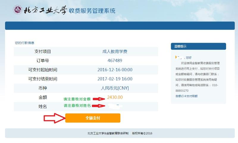 (3)核对姓名、金额等信息,确认信息无误后,点击【全额支付】,显示如下界面: