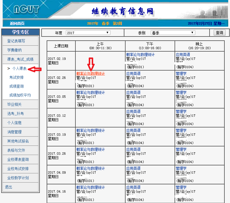 点击【个人课表】里的【课程名称】,可下载课程教学大纲以及任课教师上传的本课程的课件、习题等学习资料。