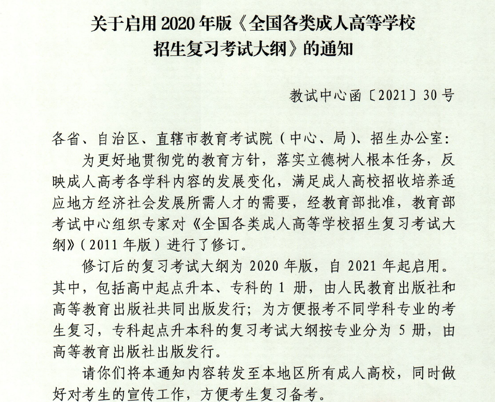 2021年北京成人高等学校招生复习考试大纲现已发布,有需要的考生请提前按下列通知中的相关信息自行购买。