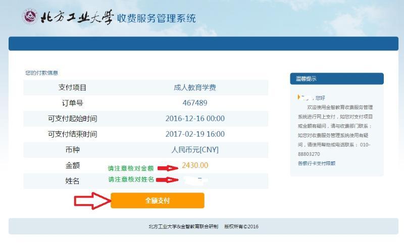 (4)核对姓名、金额等信息,确认信息无误后,点击【全额支付】,显示如下界面: