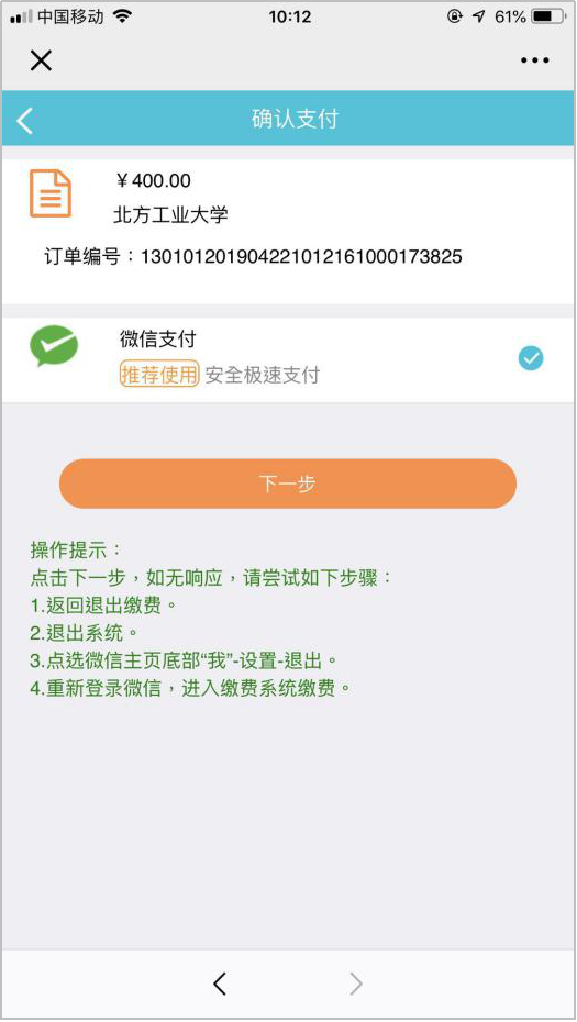 第五步:点击“下一步”,选择微信支付,输入支付密码,完成支付。